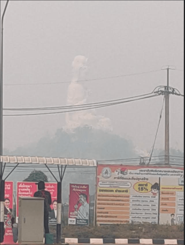 Le photographe Prathai Puriyasurawong, basé à Chiang Rai Thaïlande, a posté dimanche une photo de la statue géante de la déesse de la miséricorde en partie enveloppée par des particules de Micropoussière PM2.5. Aujourd’hui il a pris une autre photo dans l’après-midi et la déesse n’était plus visible et avait complètement disparu sous un dangereux Nuage Toxique de particules de Micropoussière PM2,5