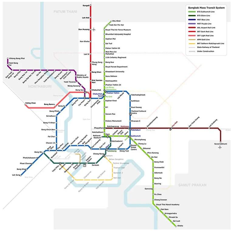 La ligne rouge SRT compte 13 stations, reliant Taling Chan et Rangsit, tandis que la ligne violette MRT, avec 16 stations, relie Bang Sue et Khlong Bang Phai.