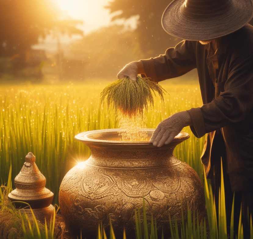 Un jour, Somchai travaillait dans son champ lorsqu’il aperçut un objet étrange au loin. Il s’approcha et découvrit que c’était un pot doré. Il le ramassa et l’ouvrit, et à sa grande surprise, il était rempli de pièces d’or.