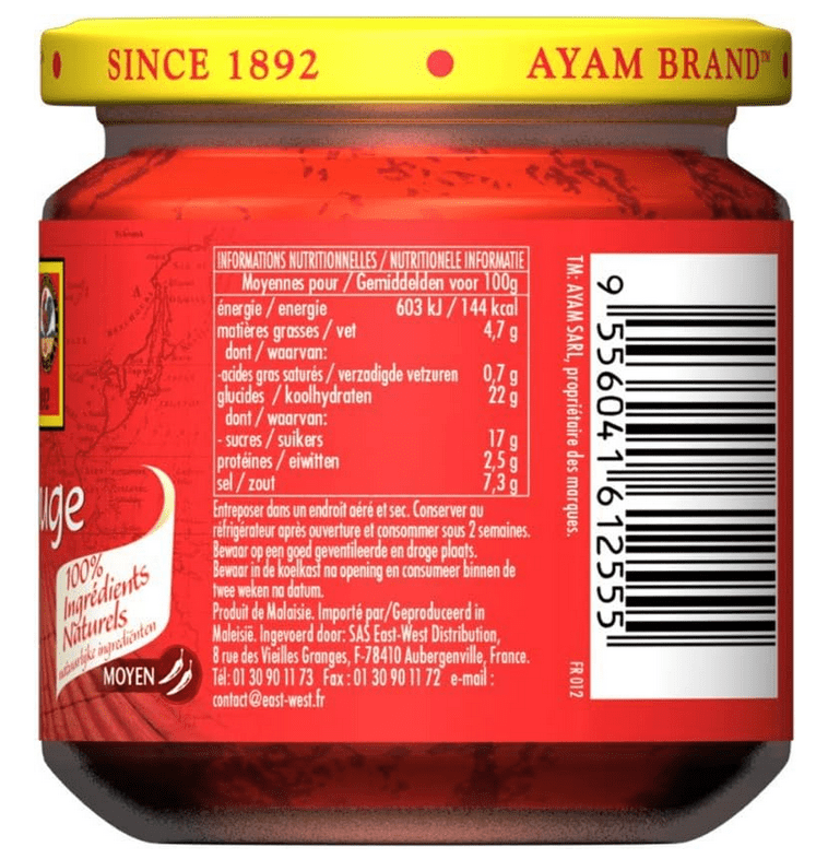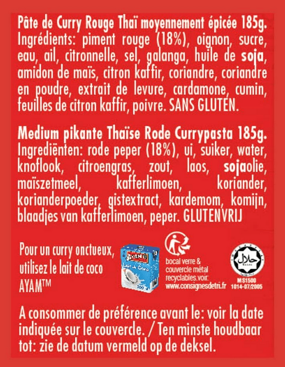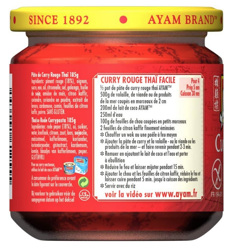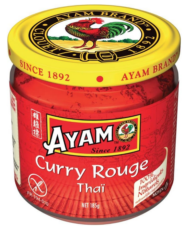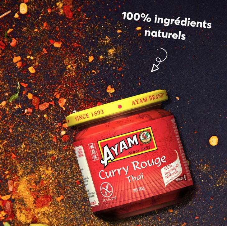 Toutes les saveurs de l’authentique curry rouge thaïlandais à la maison grâce à notre pâte de curry rouge AYAM. Ultra facile et rapide à cuisiner, notre pâte de curry rouge AYAM se marie avec à peu près tout, du poulet, du boeuf, des légumes ou même des crevettes. Mélangez-la avec notre lait de coco pour obtenir un curry thaïlandais maison aux saveurs authentiques, pour toute la famille. Notre pot de 185g peut servir 12 personnes environ. Nos pâtes de curry AYAM sont composées à 100% d’ingrédients naturels, ce qui en fait des produits de qualité supérieure. Elles sont certifiées sans gluten par l’AFDIAG et sont sans lactose et sans conservateurs. Niveau de piment : moyen ; Format familial. X3 PCS