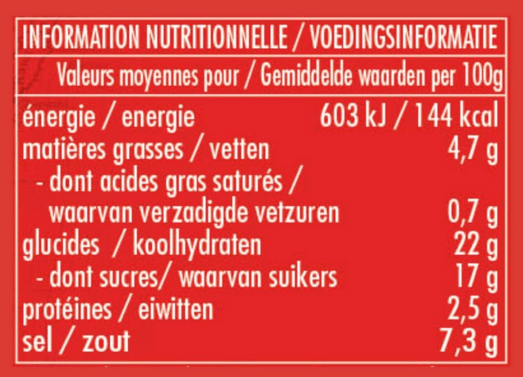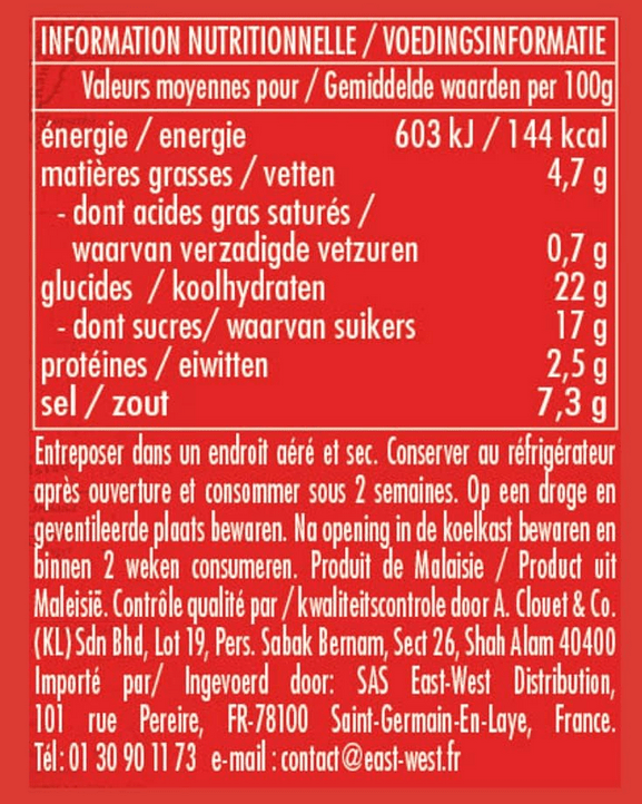 100% INGREDIENTS NATURELS PIMENT ROUGE 18%, OIGNON, SUCRE, EAU, AIL, CITRONNELLE, SEL, GALANGA, HUILE DE SOJA, AMIDON DE MAÏS, CITRON KAFFIR, CORIANDRE, POUDRE DE CORIANDRE, EXTRAIT DE LEVURE, CARDAMONE, CUMIN, FEUILLES DE CITRON VERT KAFFIR, POIVRE. (POURCENTAGE DE LÉGUMES, FRUITS ET ÉPICES > 60%)
