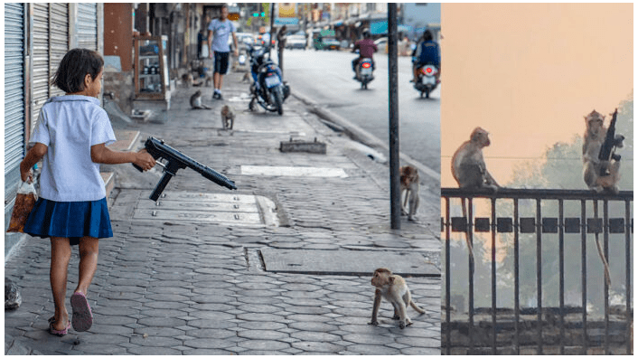 À la fin de la visite de Lopburi vendredi, alors que le Premier ministre Srettha Thavisin était sur le point de rentrer à Bangkok, un petit groupe de locaux a présenté au Premier ministre une photo devenue virale sur Internet d’une jeune fille portant une mitrailleuse d’airsoft pour se rendre à Bangkok. éviter d’être attaqué par des singes et une photo comparative d’un singe tenant un pistolet-jouet au bord de la clôture du district de Phra Prang Sam Yot Mueang Lopburi.