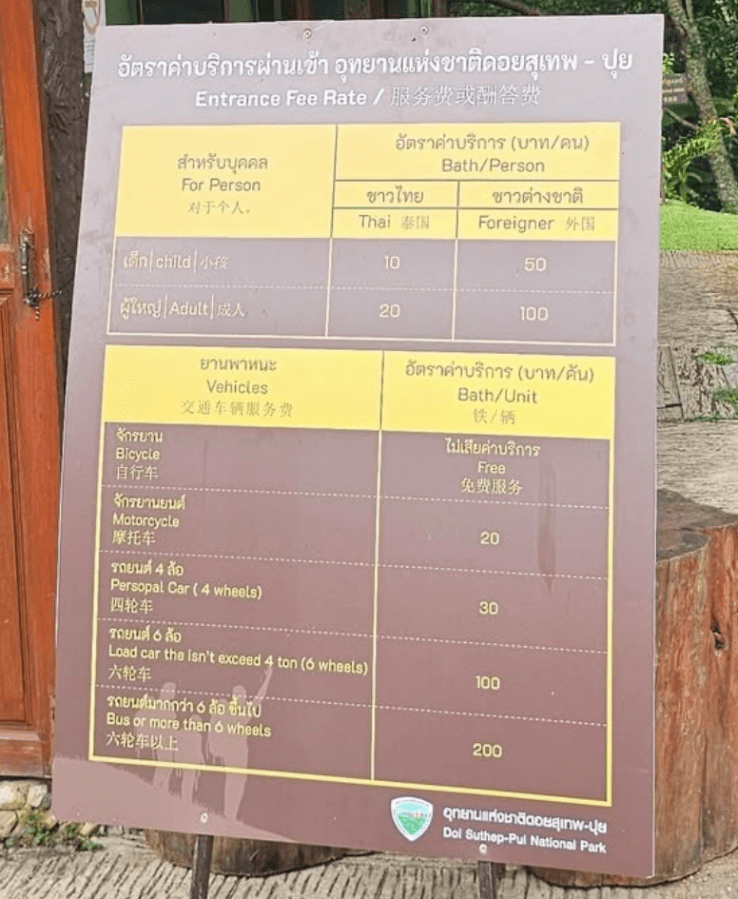 - Les droits d’entrée pour les étrangers sont de 100 bahts pour les adultes et de 50 bahts pour les enfants. Les citoyens thaïlandais bénéficient de tarifs réduits. Bien qu’il n’y ait pas de droit d’entrée pour le Wat Phra That Doi Suthep lui-même, le tramway menant au temple coûte une petite somme.