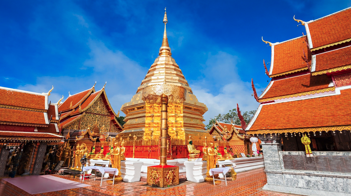 - Wat Phra That Doi Suthep : Perché à une altitude d’environ 1 050 mètres sur la montagne Doi Suthep, ce temple bouddhiste Theravada vénéré est un lieu de pèlerinage sacré et un symbole de Chiang Mai. La légende raconte qu’il fut fondé en 1383 par le roi Keu Naone pour abriter une relique de Bouddha, apportée sur le site par un éléphant blanc. Les visiteurs peuvent monter les 300 marches de l’escalier Naga ou prendre un tramway pour atteindre le temple, qui offre une vue panoramique imprenable sur Chiang Mai. La forte connexion à la légende bouddhiste et les vues panoramiques font de ce temple une attraction particulièrement captivante.